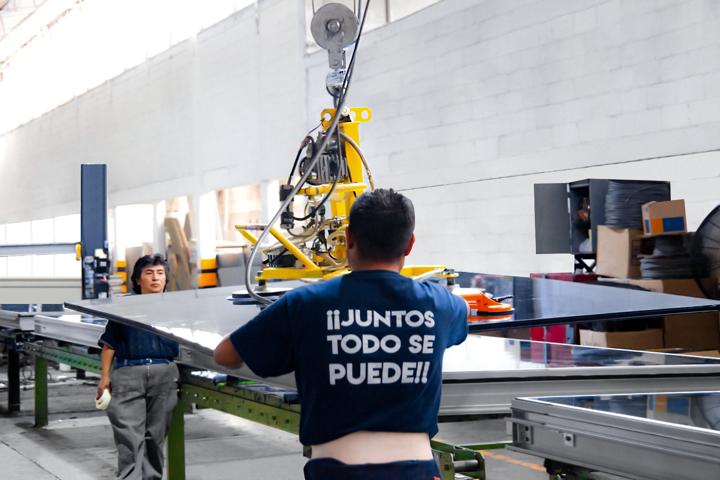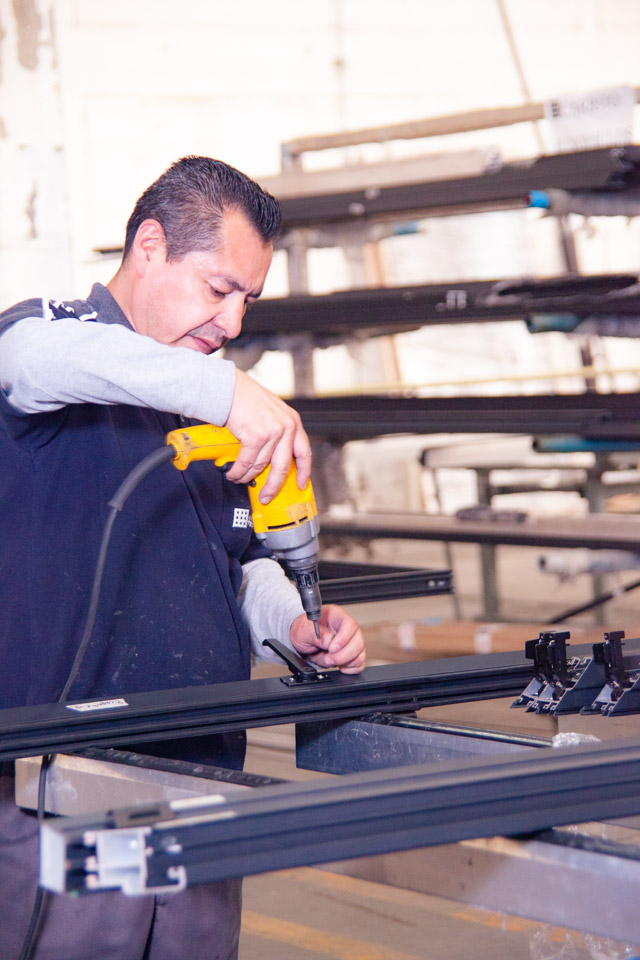 En la línea de armado, personal altamente calificado realiza el ensamblaje, armado y sellado de los perfiles de aluminio para convertirlo en el marco perimetral.