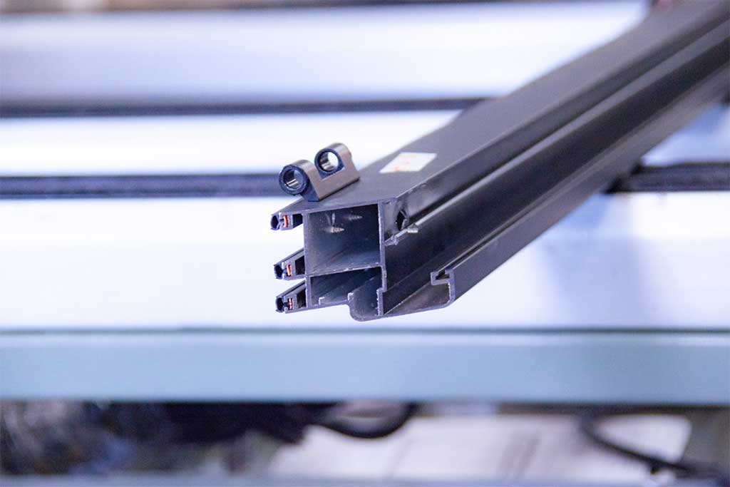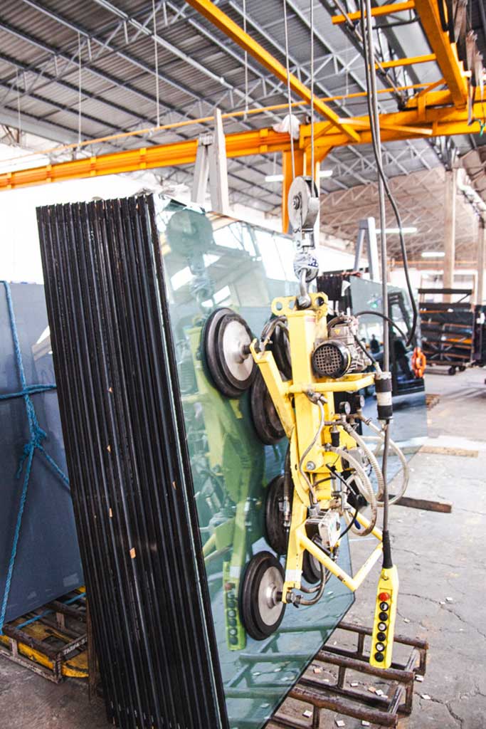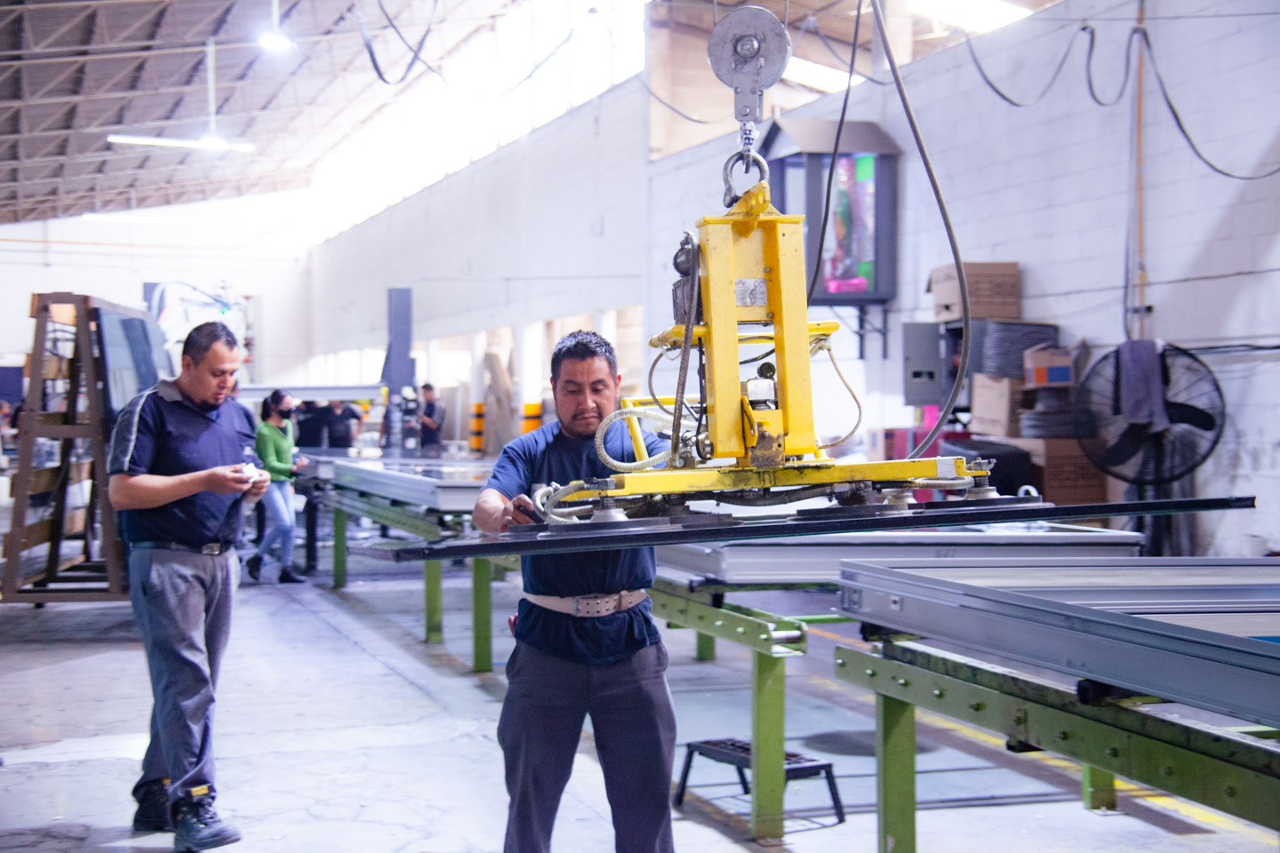En este punto, el marco del módulo, puerta y/o ventana ya se encuentra armado, pero falta el envidriado. Durante la línea producción se colocan diferentes soluciones de vidrio (sunglas ®, safeglas®, tecnodecor®, tecnocolor® entre otros) asegurando la hermeticidad del producto por medio de diferentes selladores.